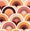 Love retro style? Take it to the max with this funky 70’s wallpaper. This print stays true to 70’s design with layers of rounded shapes in sunset pink, deep purple and orange. Create a retro paradise by featuring this design in a living room or bathroom.