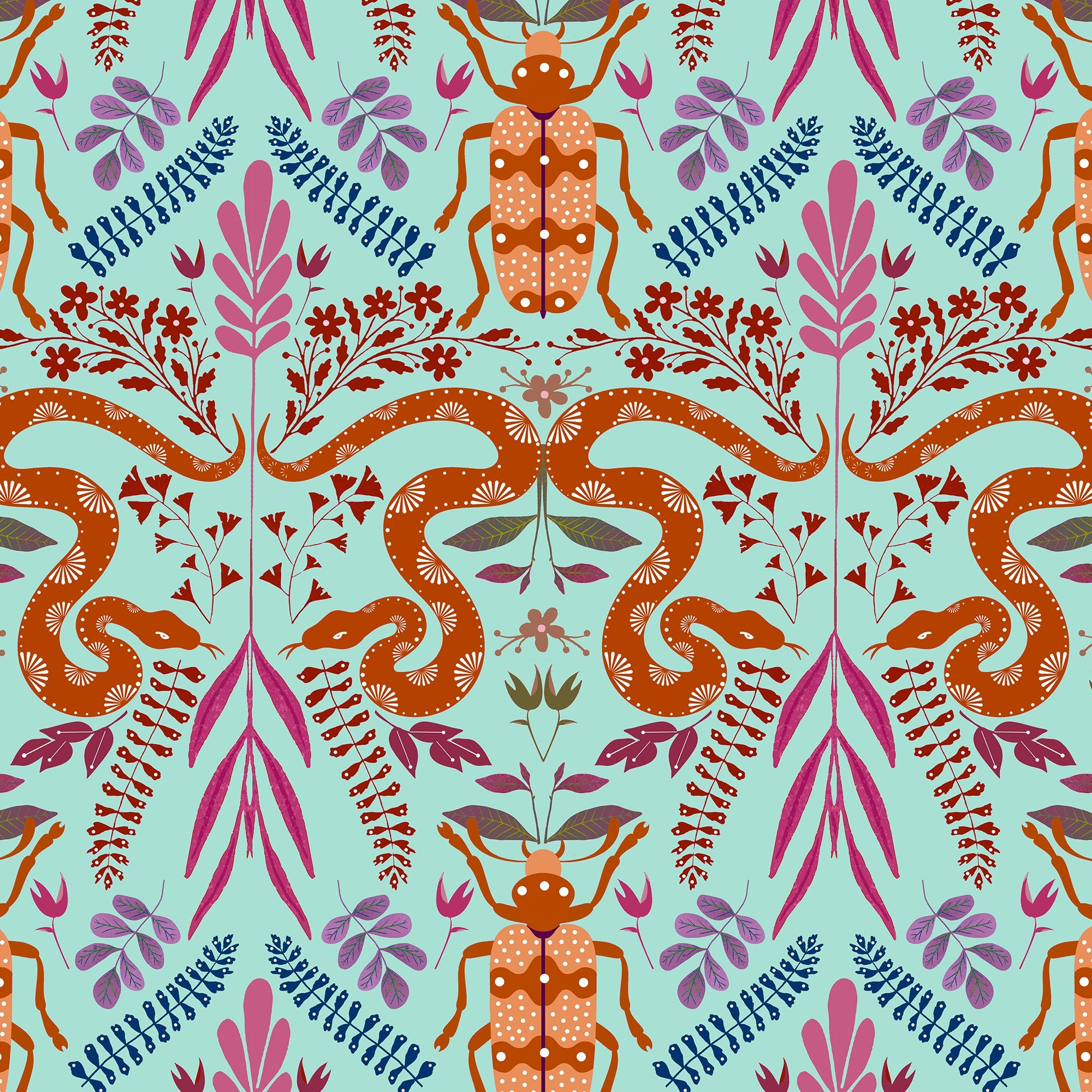 The bright scarabs glow like precious stones as the beetles add a pop of fiery energy. The intricate leafy damask weaves it all together, creating a sophisticated camouflage that feels both wild and perfectly poised. Itβs a maximalist retreat for anyone who believes that nature is the ultimate artist.